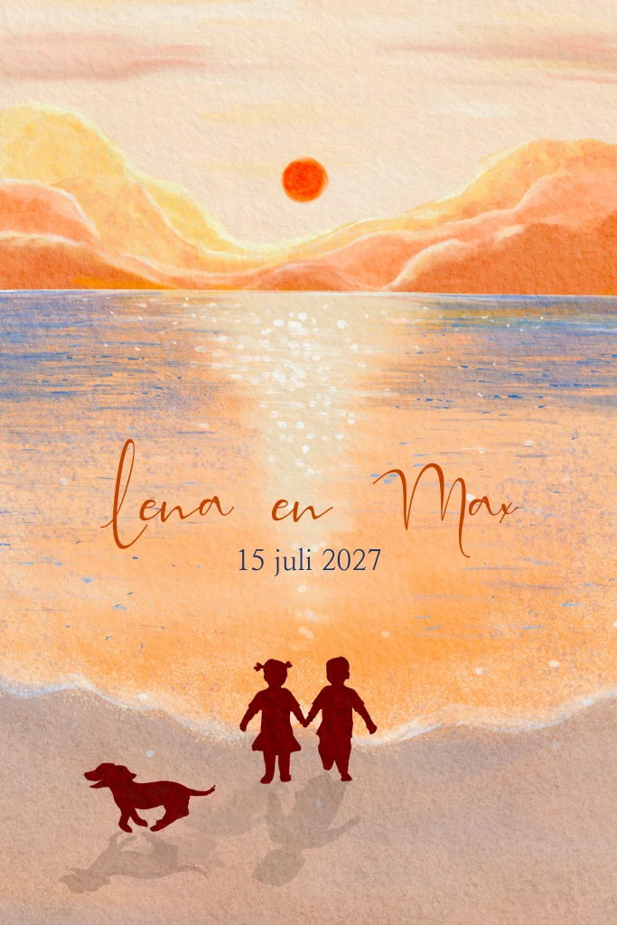 Voor alle strandliefhebbers! Een geboortekaartje voor een tweeling met een schildering van een ondergaande zon op het strand met silhouetten van 3 kinderen en een hondje. Heb je een verzoekje voor een aanpassing? Dat kan! Stuur gerust een berichtje en ik help je graag.