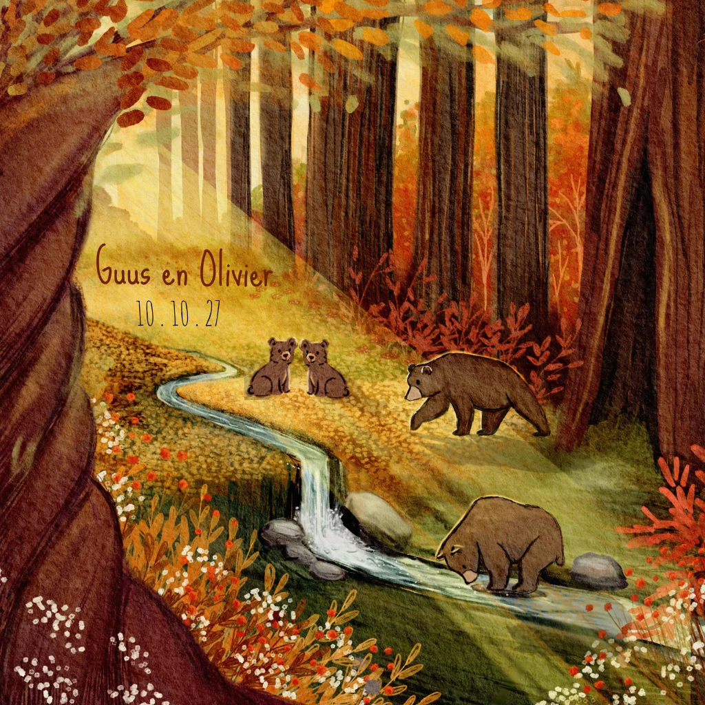 Warm herfst geboortekaartje voor een tweeling met familie beren in het bos bij een beekje.