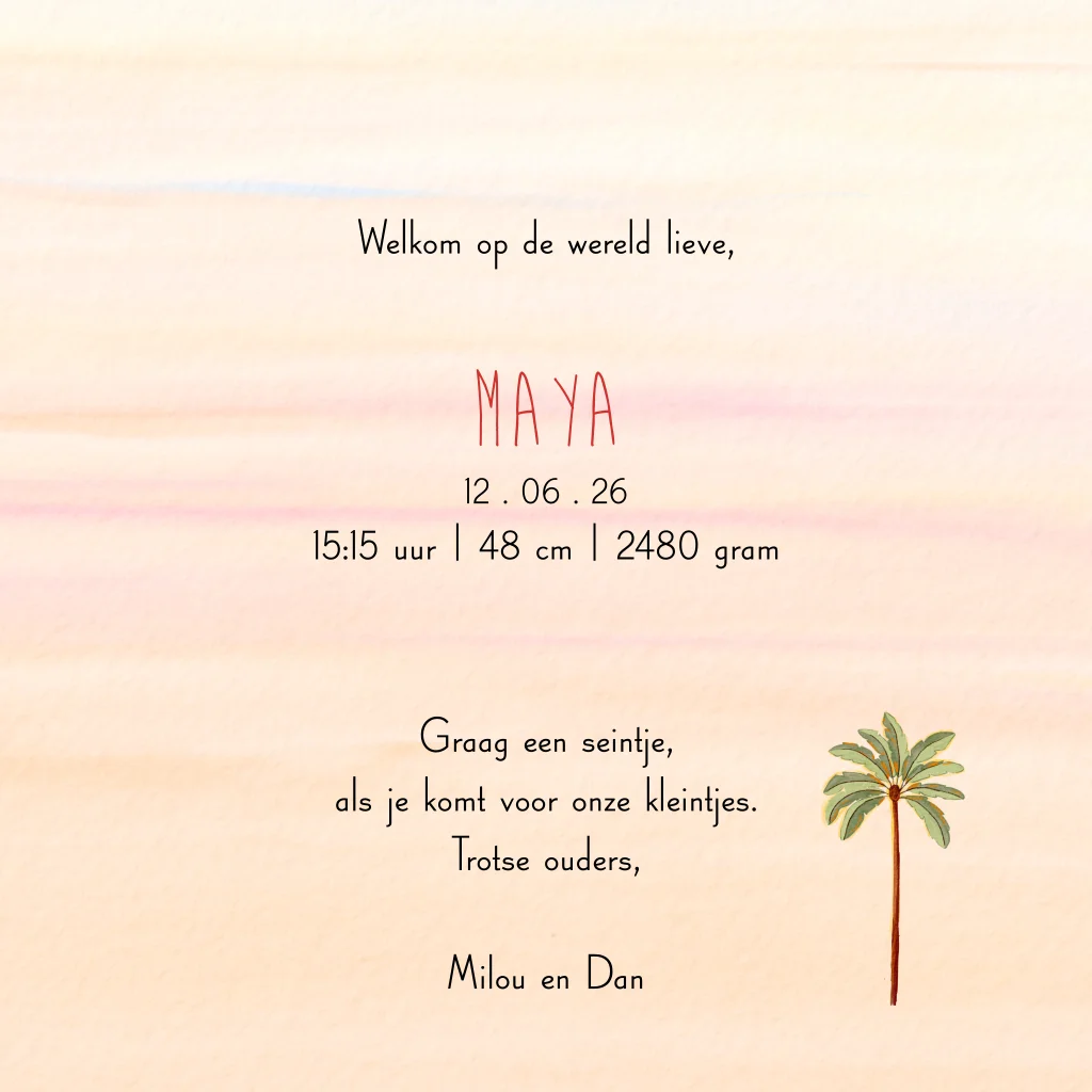 Warm, kleurrijk geboortekaartje voor een tweeling met Afrikaanse savanne, ooievaar, olifant, giraf en stokstaartjes.