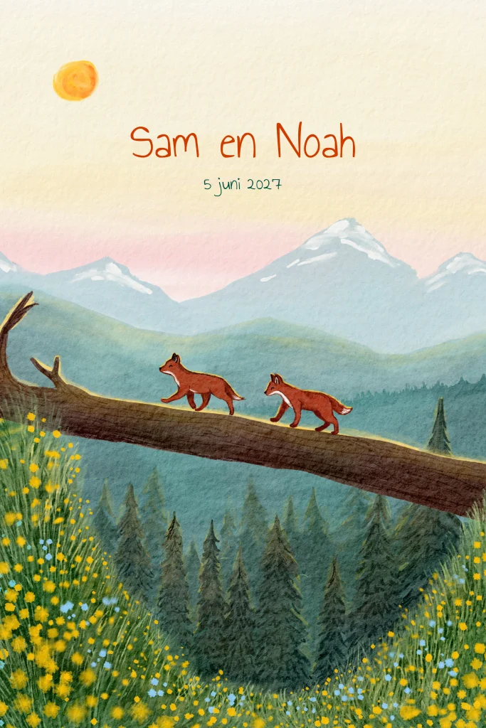 Stoer kleurrijk geboortekaartje voor een tweeling met vosjes in een berglandschap.