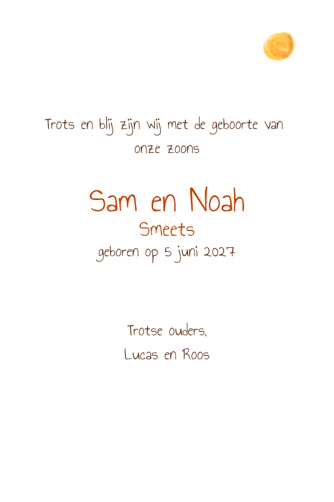 Geboortekaartje voor een tweeling met parade vosjes op een boomstam