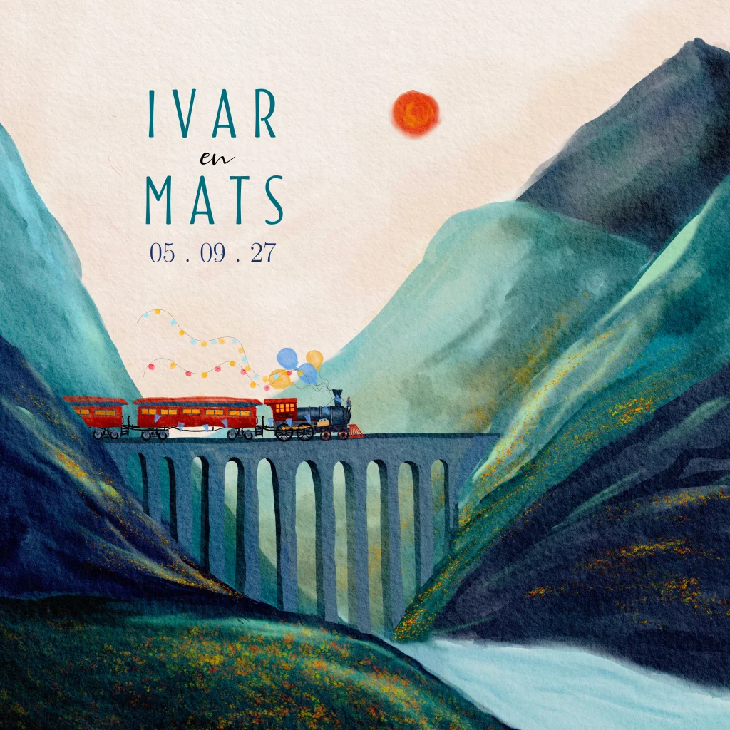 Geboortekaartje voor een tweeling met een trein in berglandschap