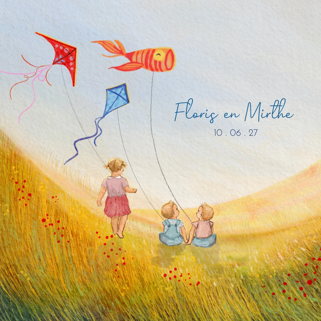 Geboortekaartje voor een tweeling: vliegeren samen met zus of broer