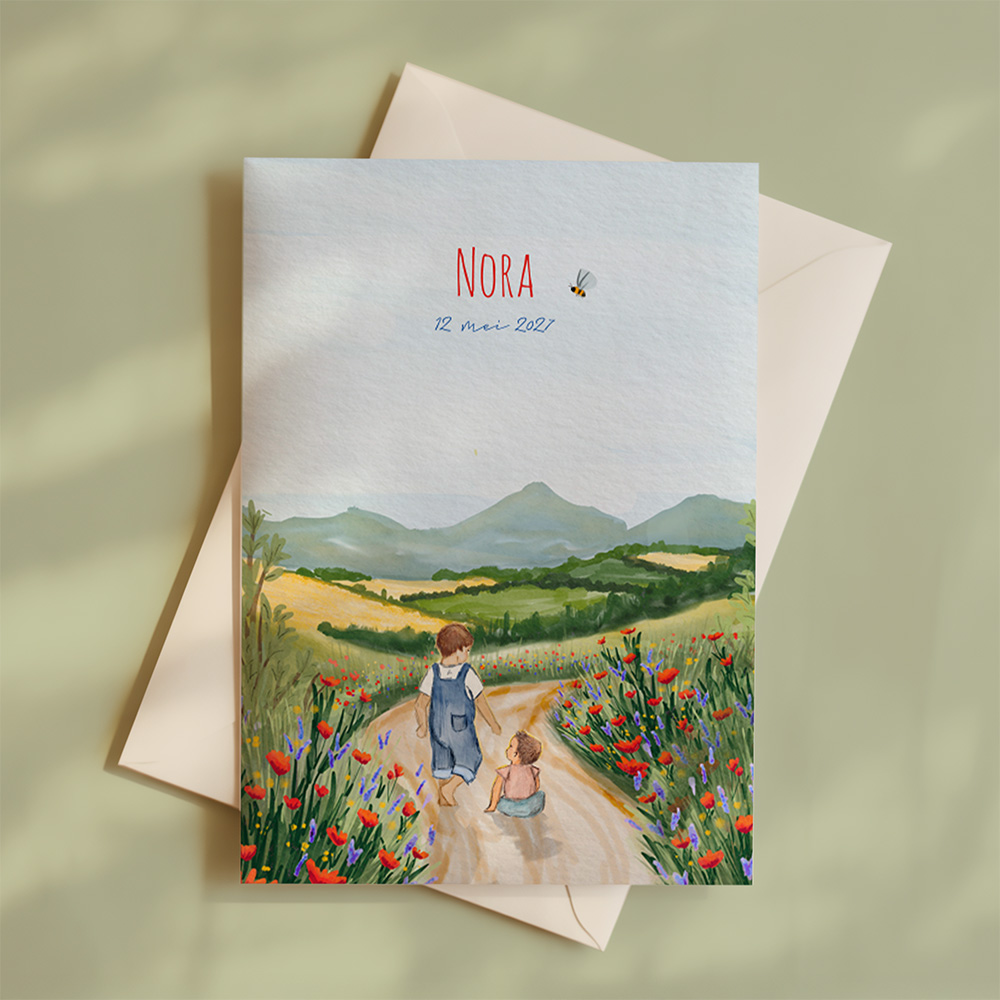 Een lief geboortekaartje met aquarel schildering van een landschap met wandelpad en bloemen. Je kan zelf je favoriete kindje toevoegen met de editor.