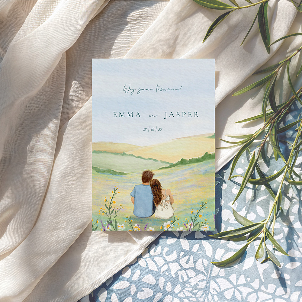 Trouwkaart met aquarel schildering van een heuvellandschap en portret van het bruidspaar.
