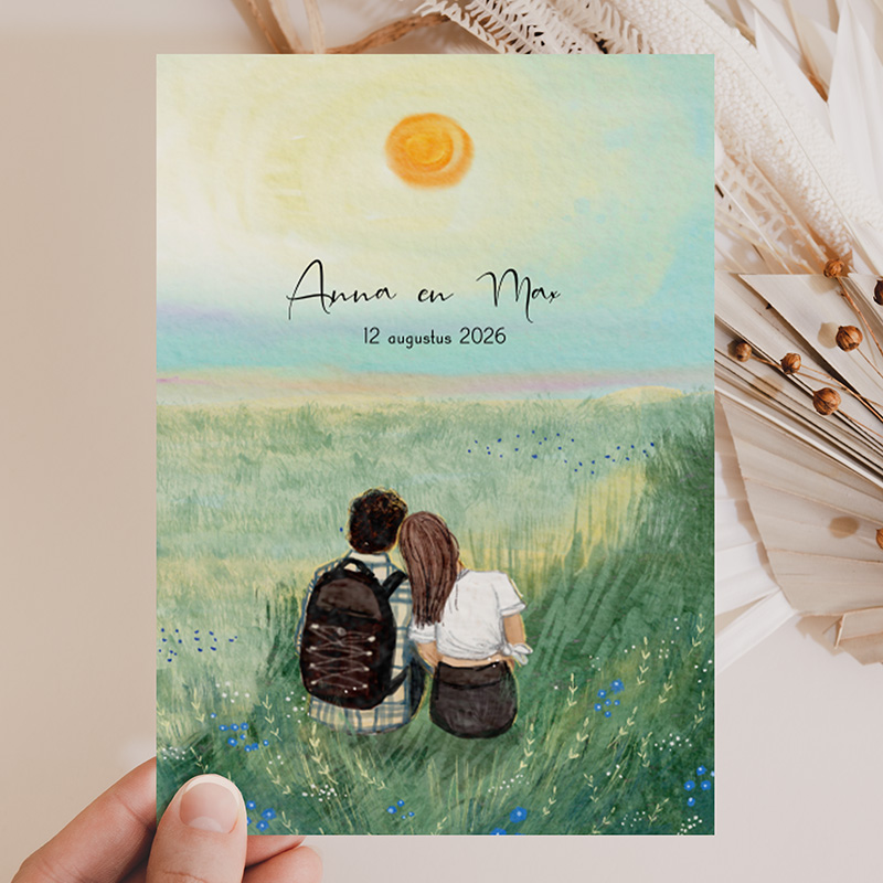 Trouwkaart met verloofdkoppel in aquarellandschap